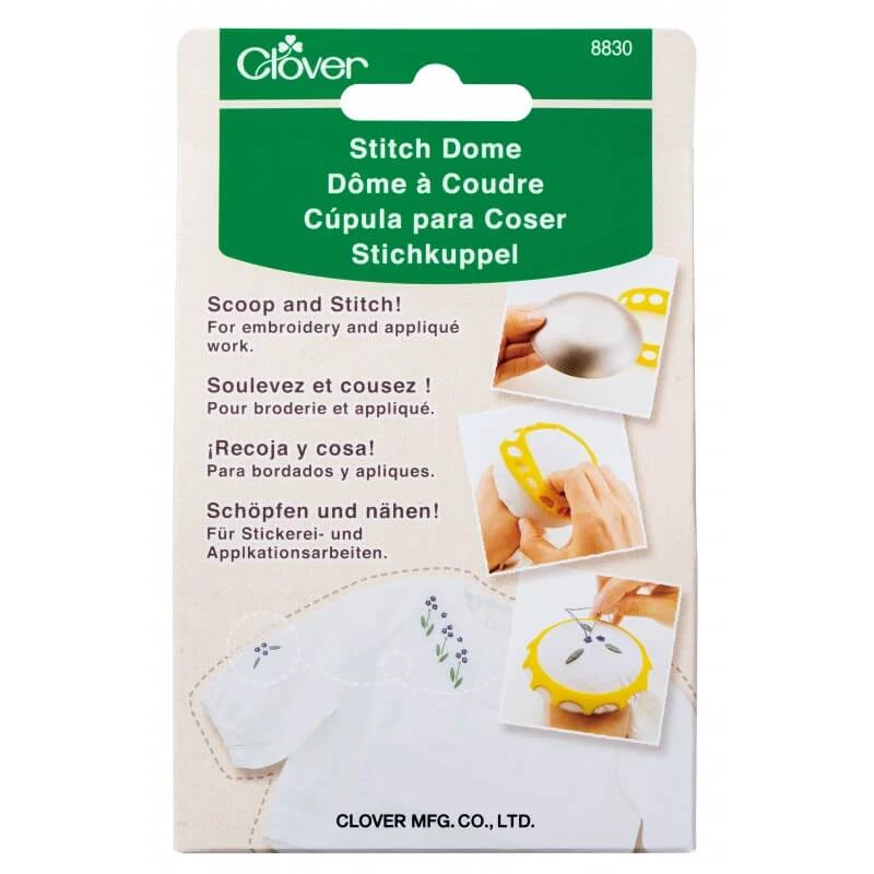 Designt für Stickerei und Handapplikation ist die Stickkuppel von Clover aus Japan ein praktisches Helferlein, das kinderleicht auch an Rundungen und Ecken auch fertiger Nähprojekte zum nachträglichen Besticken angebracht werden kann. Der „Stitching Dome“ sorgt dabei für gleichmäßige Spannung und glatte Oberfläche des Stoffes, sowie präzisere, faltenfreie Stickereien.