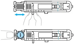 - Knopflochschablone am hinteren Fußende ausziehe, Knopf einlegen und Knopflochschablone zuschieben, bis der Knopf fest umschlossen ist.