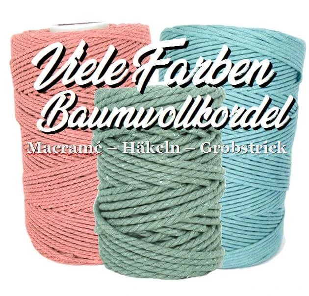 Hochwertiges MacramĂ©-Garn aus 45-fĂ€dig gezwirnter Baumwolle in 4.5 mm GarnstĂ€rke perfekt fĂŒr das KnĂŒpfen in Makrameetechnik, zum HĂ€keln & Stricken als Grobstrickgarn.