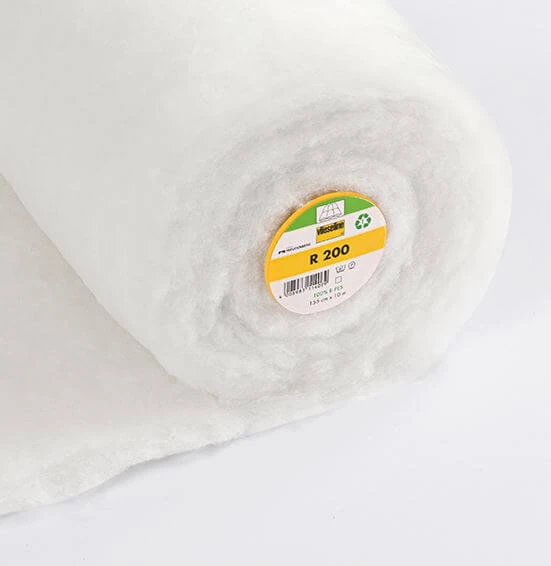Schweres, extrem bauschiges, nähbares Volumenvlies mit weichem Griff aus 100% reycelten Polyesterfasern mit hoher Migrationsresitenz.